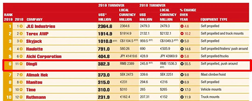 As one of the leading enterprises of aerial working platform in China, Zhejiang Dingli has been included in the "Access M20" list for many years, and has been ranked in the top 10 for two consecutive years.