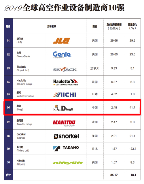 According to the List of World Plus 50 Construction Machinery Manufacturers (2019), Zhejiang Dingli ranks 18th, up 17 places from 2017.