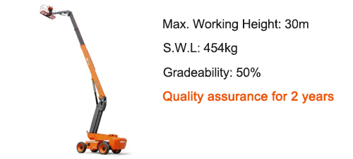 The 10 boom products mentioned above, with the max. load capacity of the telescopic boom lift up to 454kg and the max. load capacity of the articulating boom lift up to 300kg, are the best in the industry with large load capacity at a working height of 30 meters.