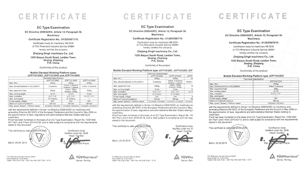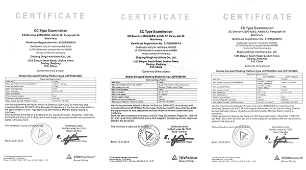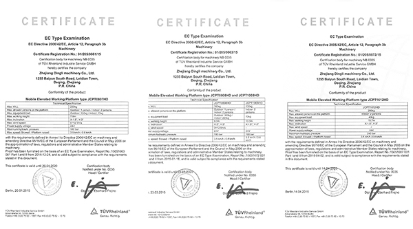 With efforts for one year, all series of scissor lift electric drive system manufactured by Zhejiang Dingli passed the certification of TUV Rhine, Germany and were granted with CE certificate. Zhejiang Dingli is the only AWP manufacturer in China that conforms to European AWP latest standard (EN280:2013) and that gets certification of TUV Rhine, Germany.