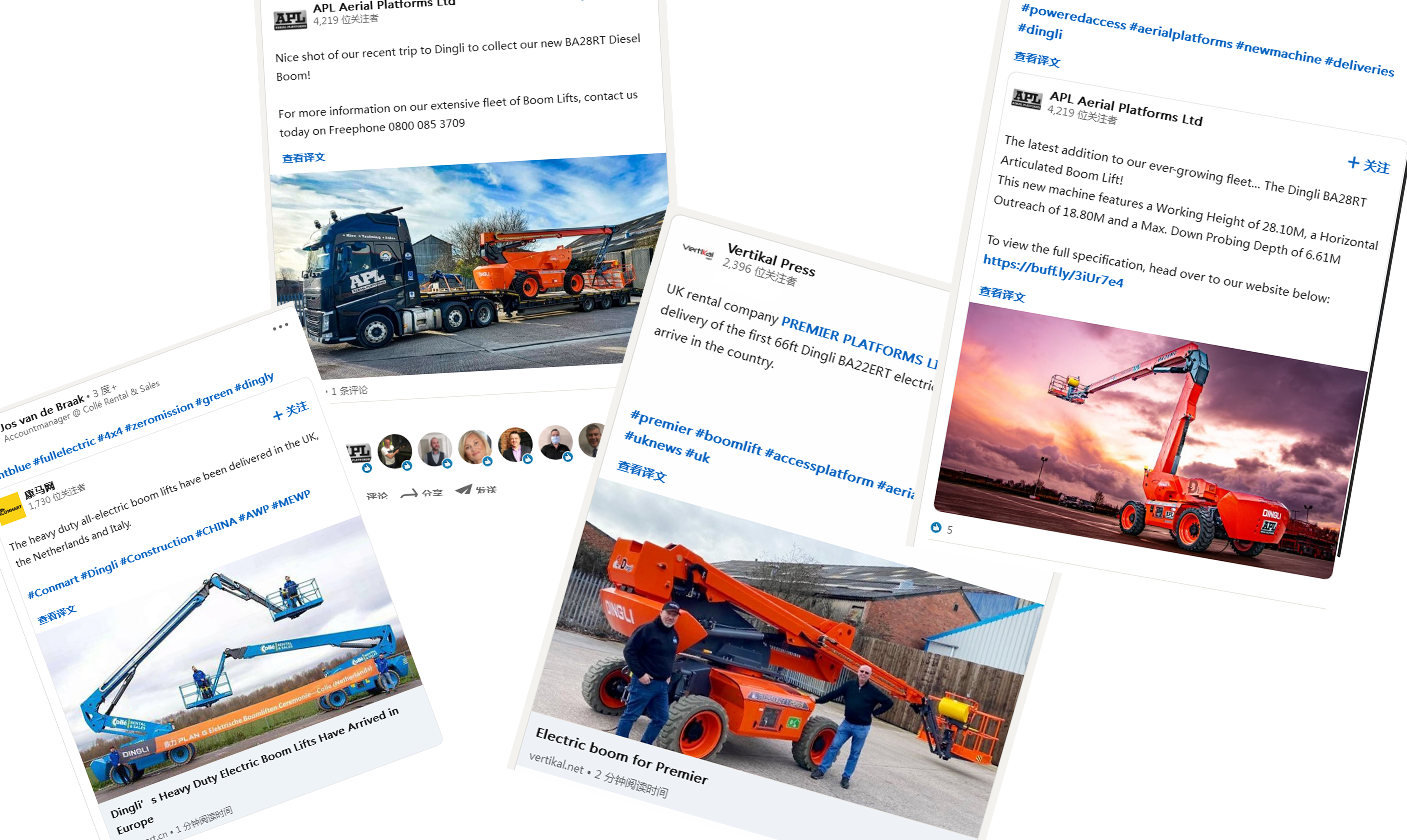 Since last year, The "PLAN G" operation of Dingli electric boom Lifts has been heard all over the world, and has been sought after by many customers in overseas markets, including Magni of Italy, Colle of the Netherlands, Charles Wilson of the UK, etc.